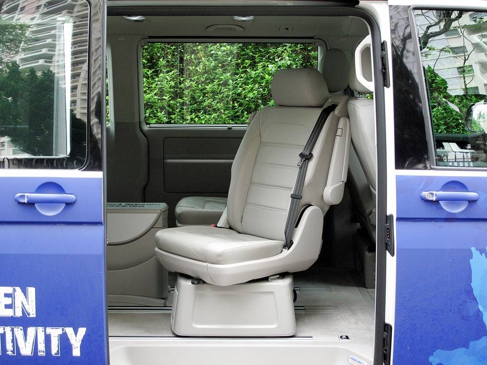 狄:跟日系豪華MPV不同,Multivan把最厚最舒適的座椅設於第三排,當進行商務活動時,可以把中座180度扭轉,方便跟客人face to face詳談,客人則可不用坐倒車安坐尾排。每張中排及後排座椅底部都設有小型儲物櫃,方便存放私人物品或文件;可前後移動及隨意升降的圓枱,除了配備杯架之外,底部兩側還可存放報章雜誌或手提電腦,再加上頂置4顆滾動式射燈,完全是一所流動辦公室的格局。
