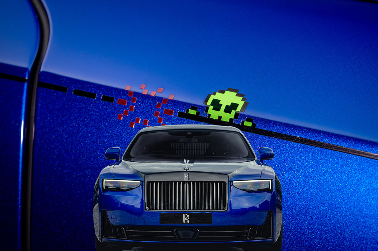 當懷舊像素遇上勞斯萊斯Black Badge Ghost,結果便是可愛的叛逆感覺。車身採用雙色漆面設計,主體以Salamanca Blue薩拉曼卡藍鋪陳,象徵經典街機的超金屬質感;上半部則覆以Crystal over Diamond Black水晶鑽石黑,閃爍出霓虹燈般的深邃光澤,讓整輛車在夜色中彷彿從老式遊戲機櫃中「復活」。